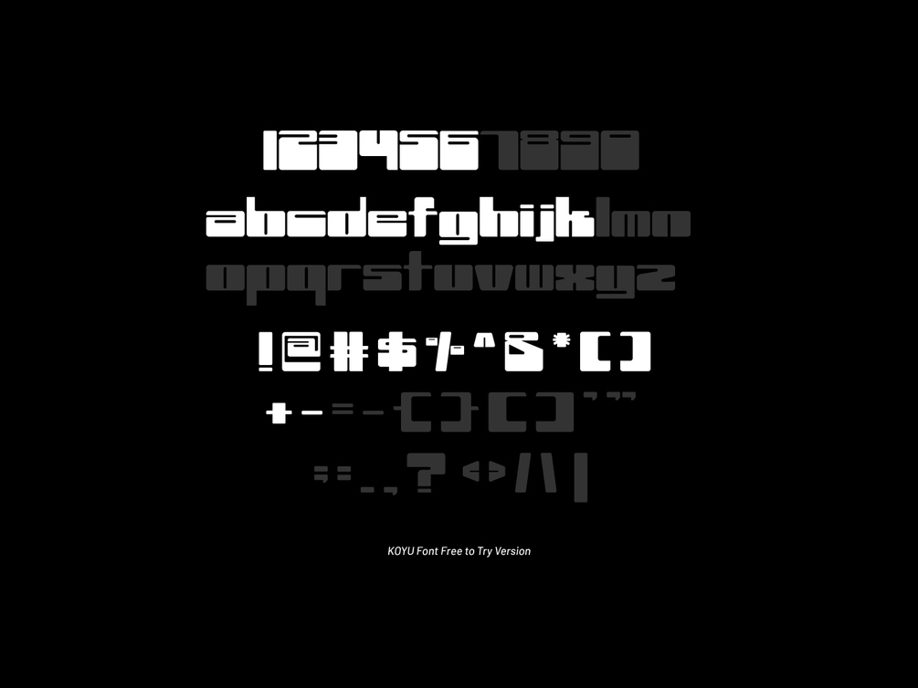 KOYU is an experimental typeface designed by Noel Hoe. The typeface is a mixture of all existing font families, hence featuring a peculiar look in terms of the letterform shaping and spacing of the typeface. KOYU includes 26 letters of the Latin alphabet, 10 numbers, 31 symbols & punctuations.